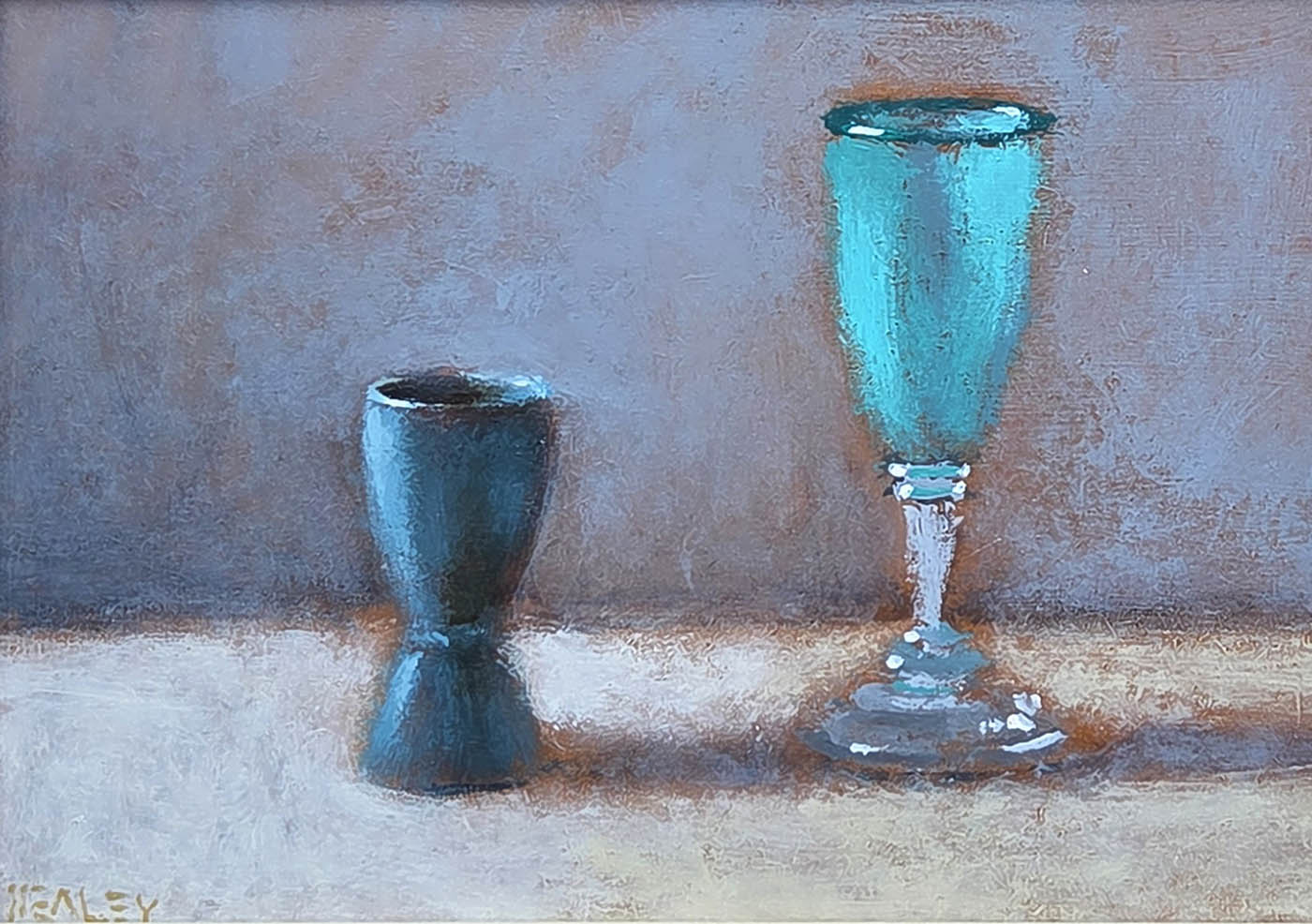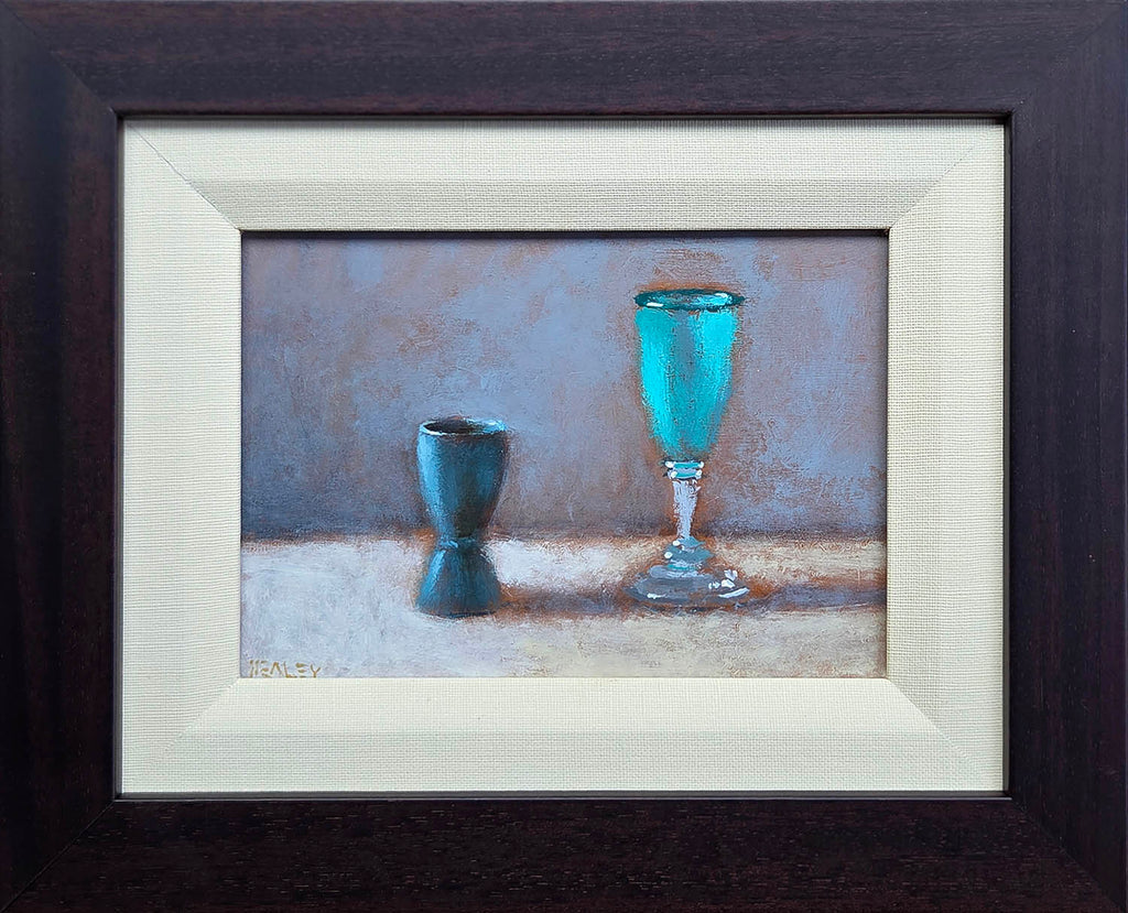 It is framed in a dark wood frame, with a cream linen liner. The outside framed dimensions are 9 x 11 in.