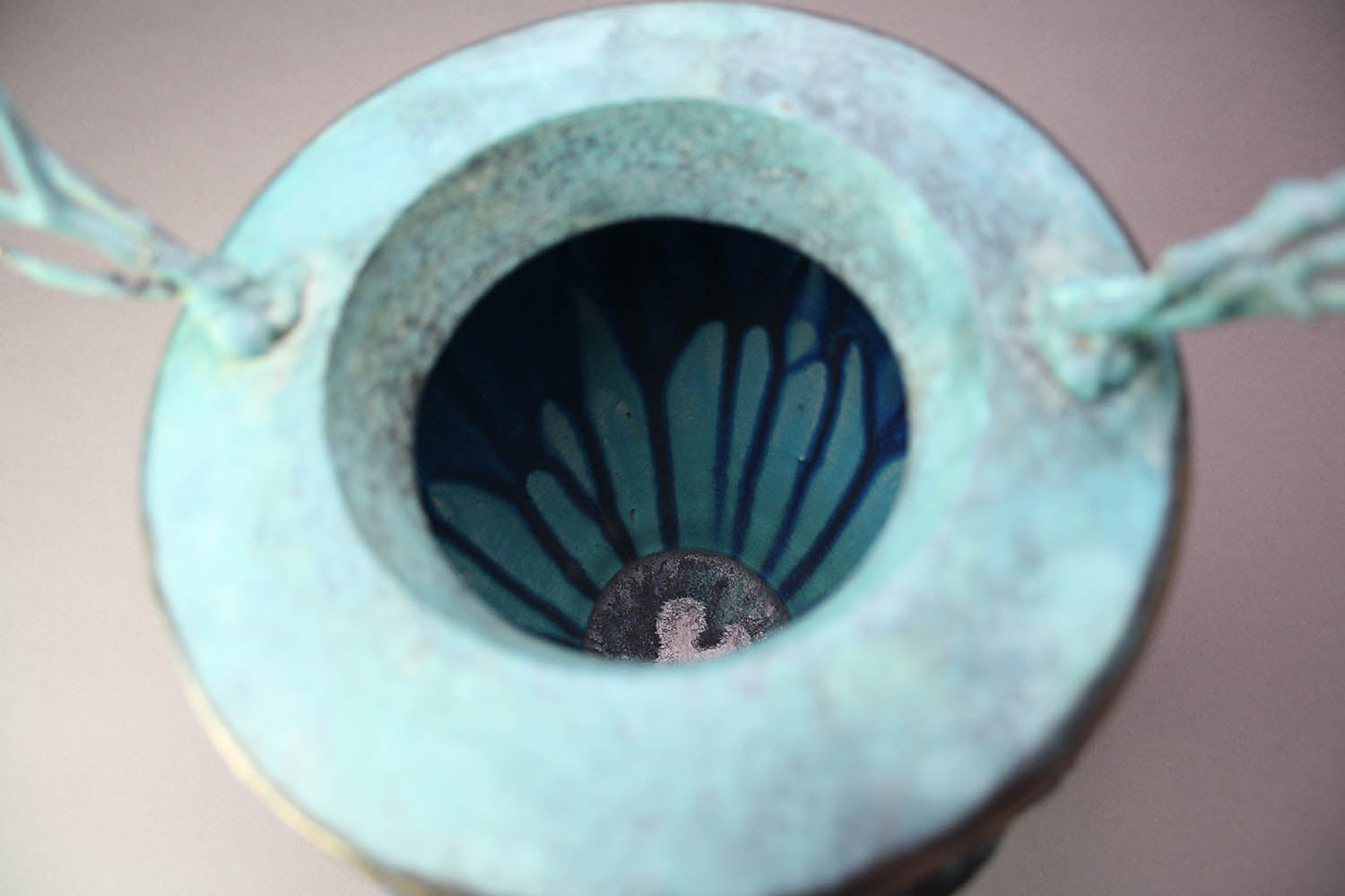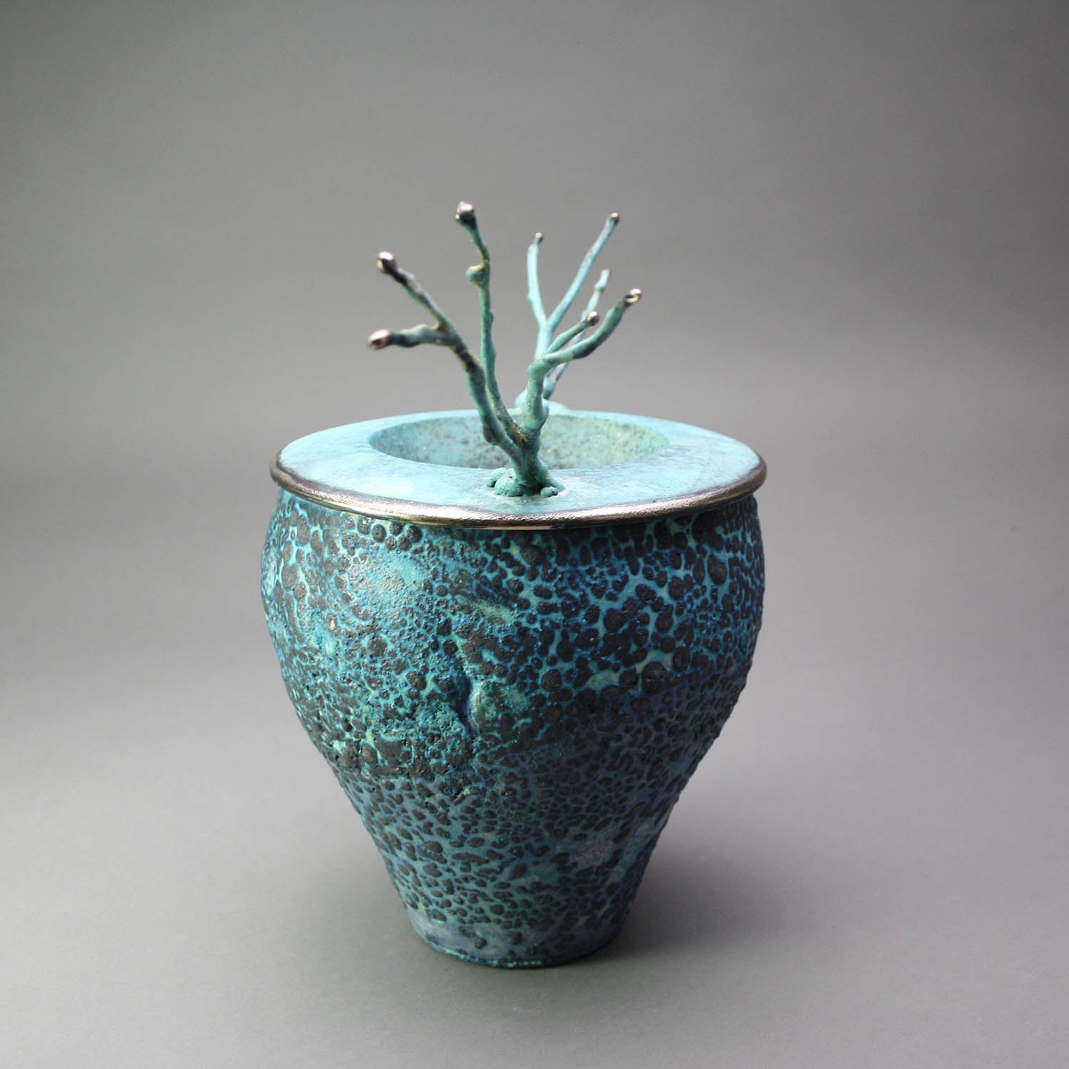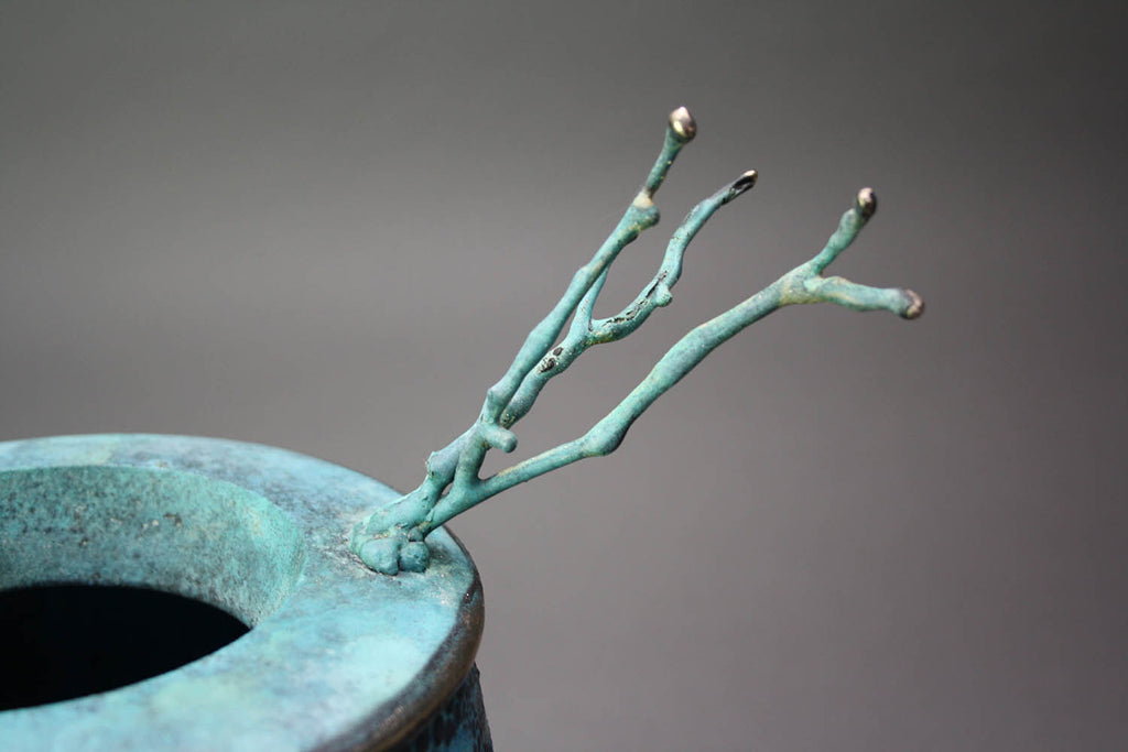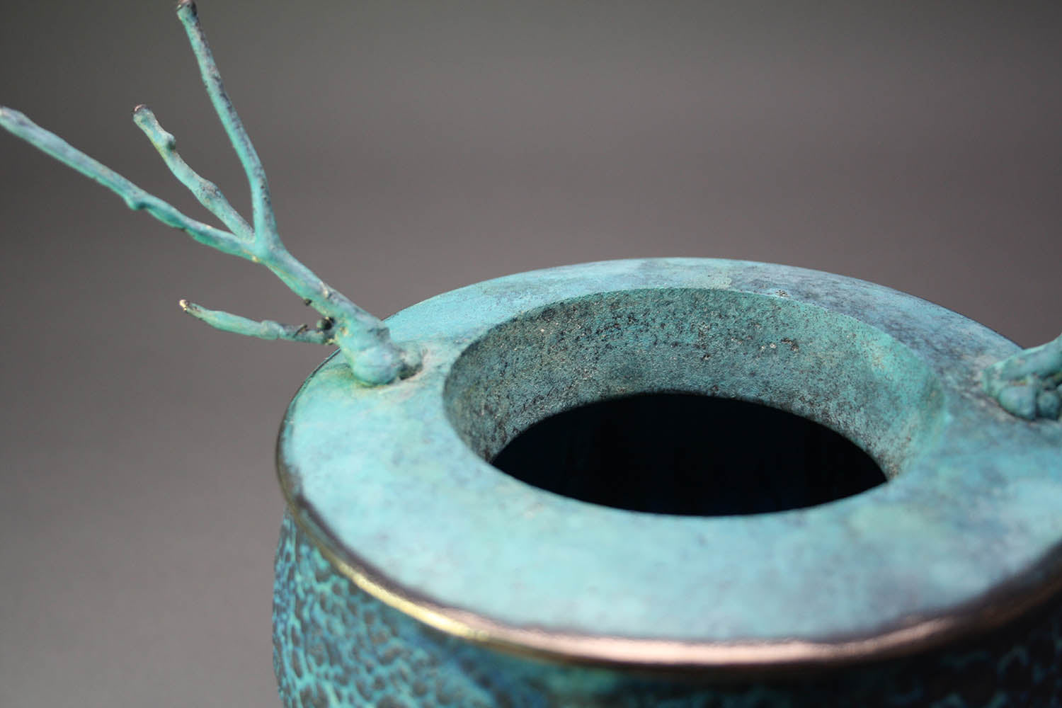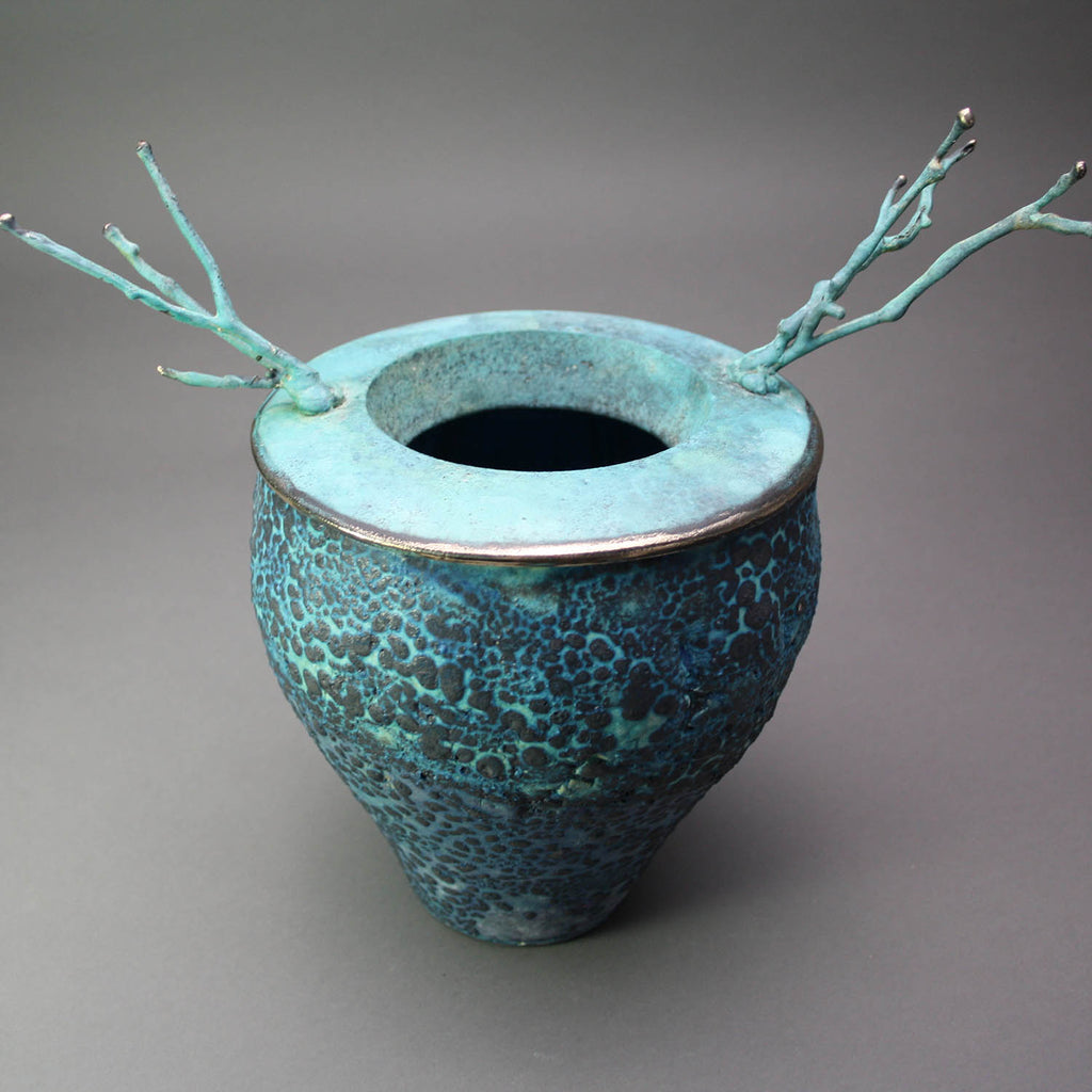 This vessel was created in 2025 and fired at cone 06. It has a cast bronze rim and twigs. It is wheel thrown and altered.