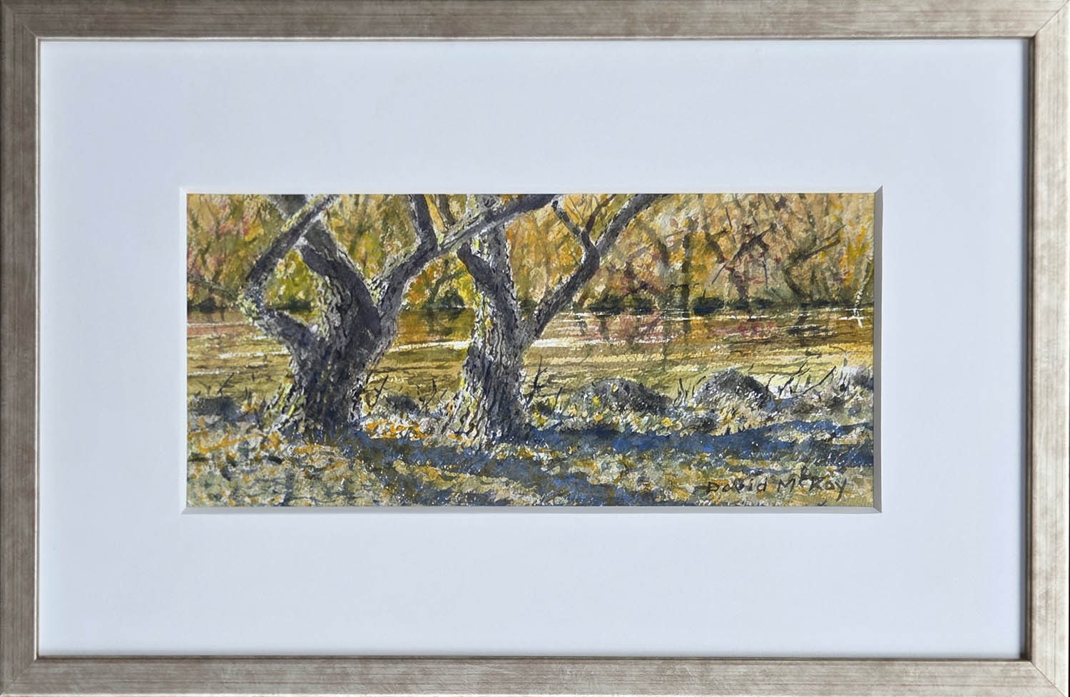 This painting was created in 2025. It is framed with archival materials, including acid-free matboards and UV-protective art glass.