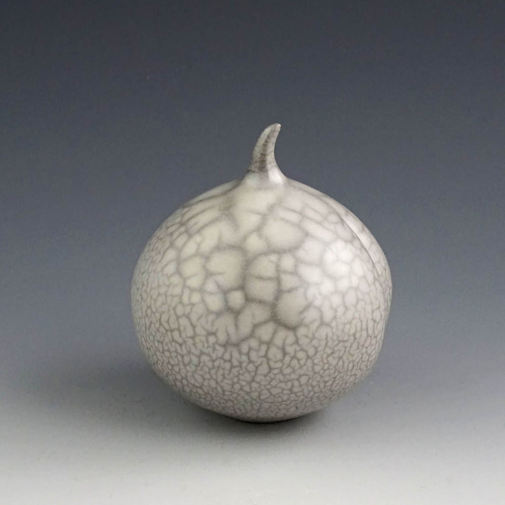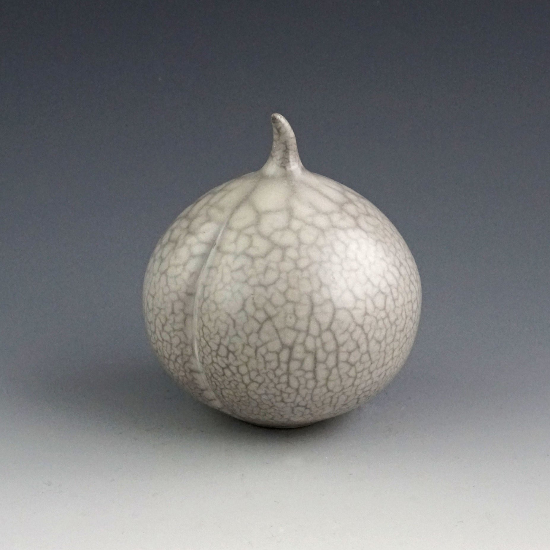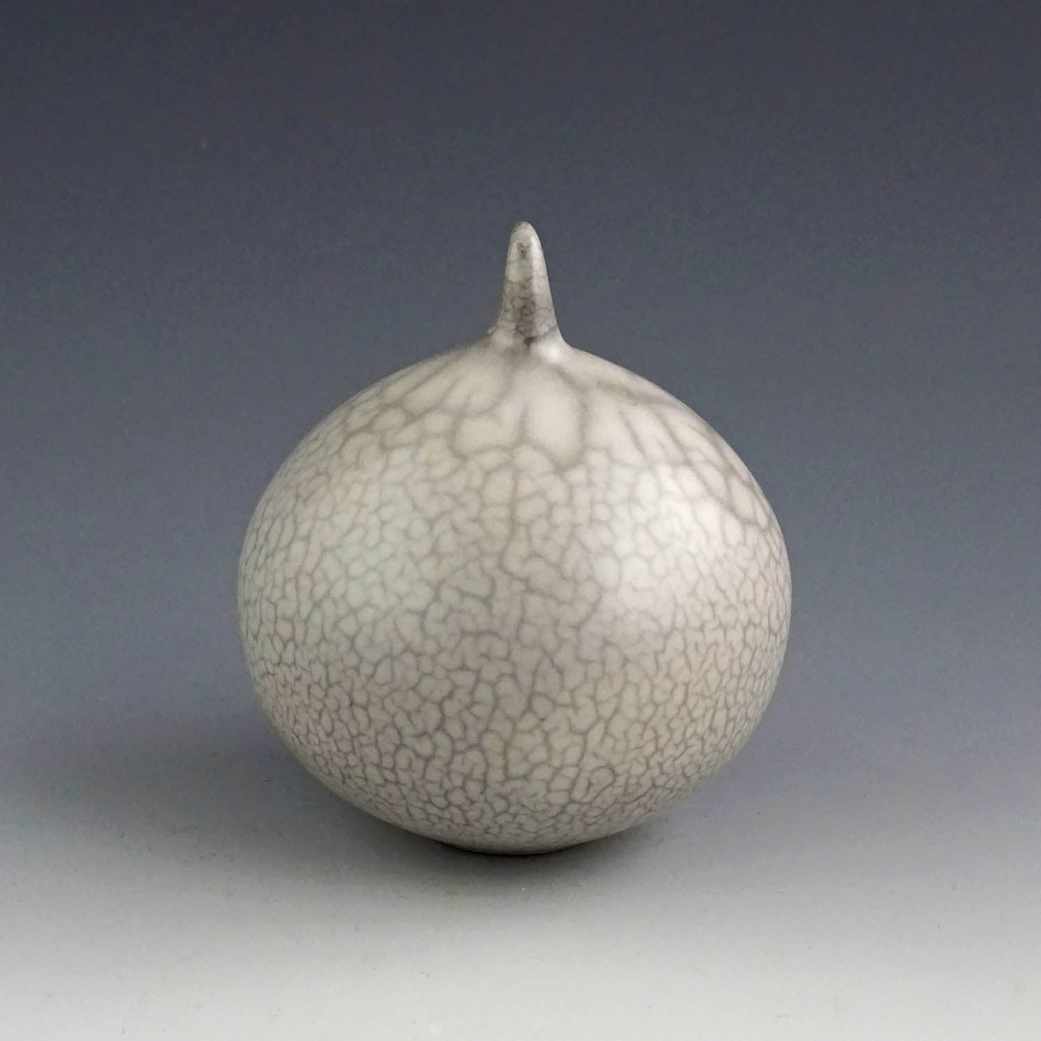 This one is called the Naked Raku-firing process. It is a variation derived from Western Raku firing techniques but differs in that these smoked pieces are unglazed. With this process, the piece is coated with a layer of clay slip and after drying, a crackle glazed is poured on top of the slip layer. The slip acts as a barrier or ‘resist’ layer which prevents the melted glaze from adhering to the piece so that the slip and glaze will separate from the clay surface after firing. It is fired in a small propane kiln to 850 degrees Centigrade, removed from the kiln “red-hot” and placed in a metal container with combustibles such as sawdust or newspaper. The fracturing action of the slip and glaze layers when penetrated by the smoke, leaves both striking and subtle patterns of dark, smoked lines on the white clay surface.