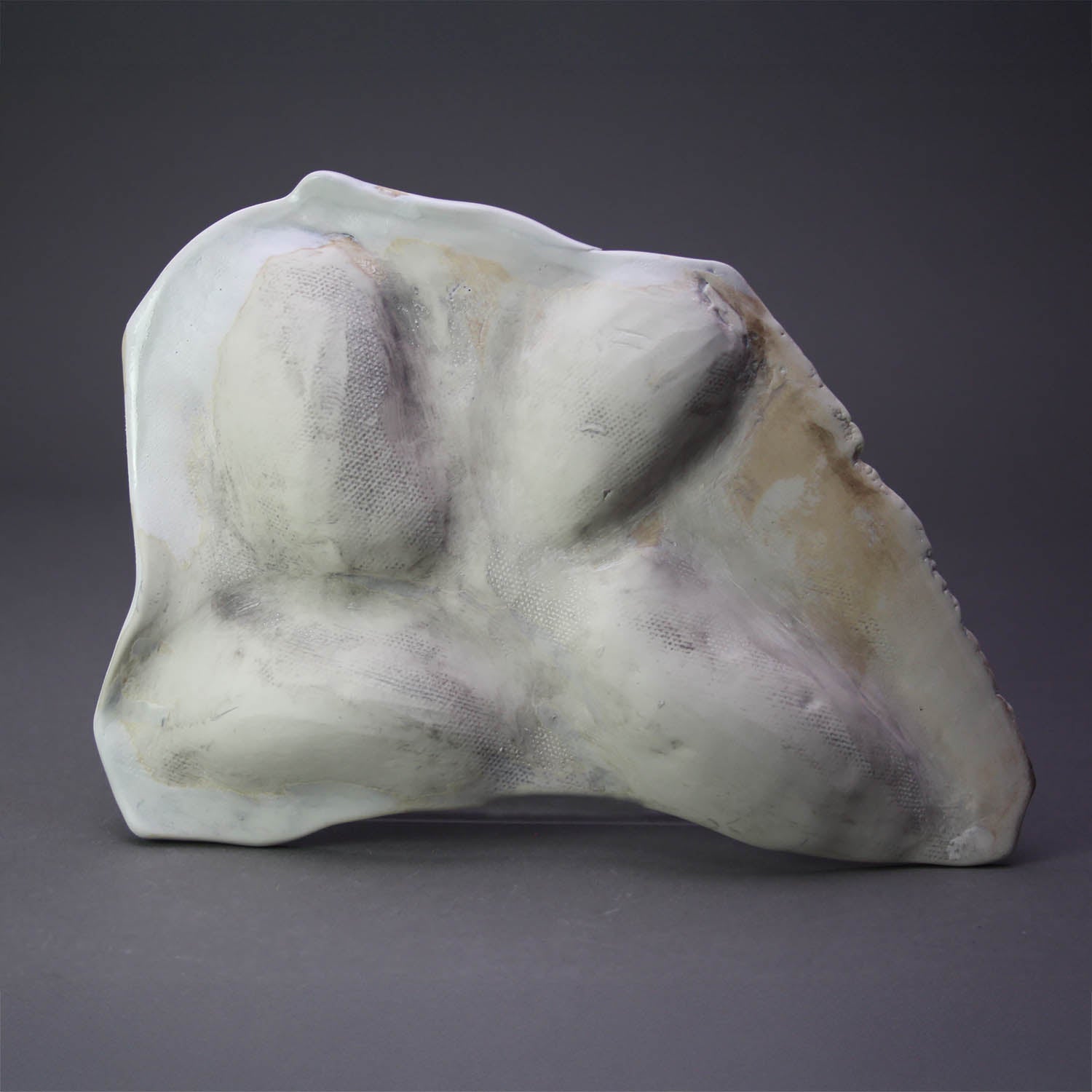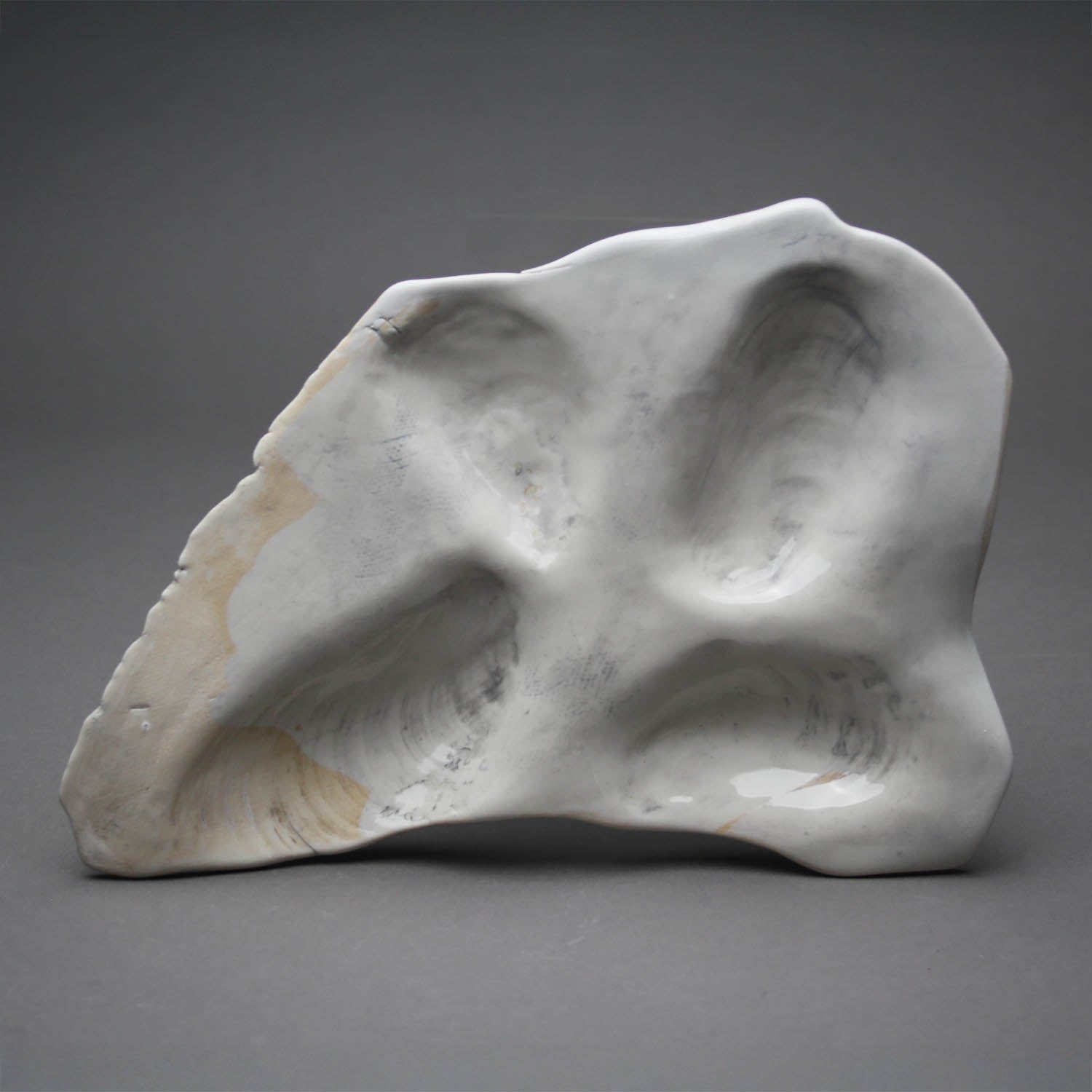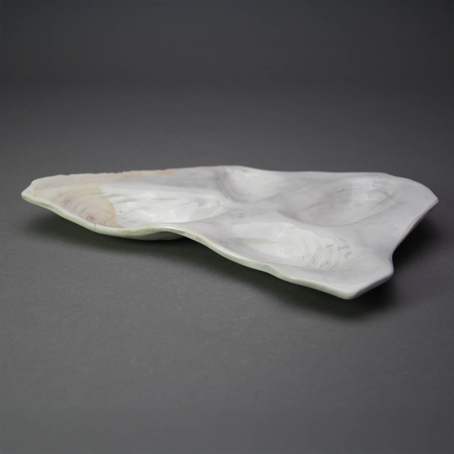 This white porcelain plate was handbuilt in 2025. It can accommodate four oysters.