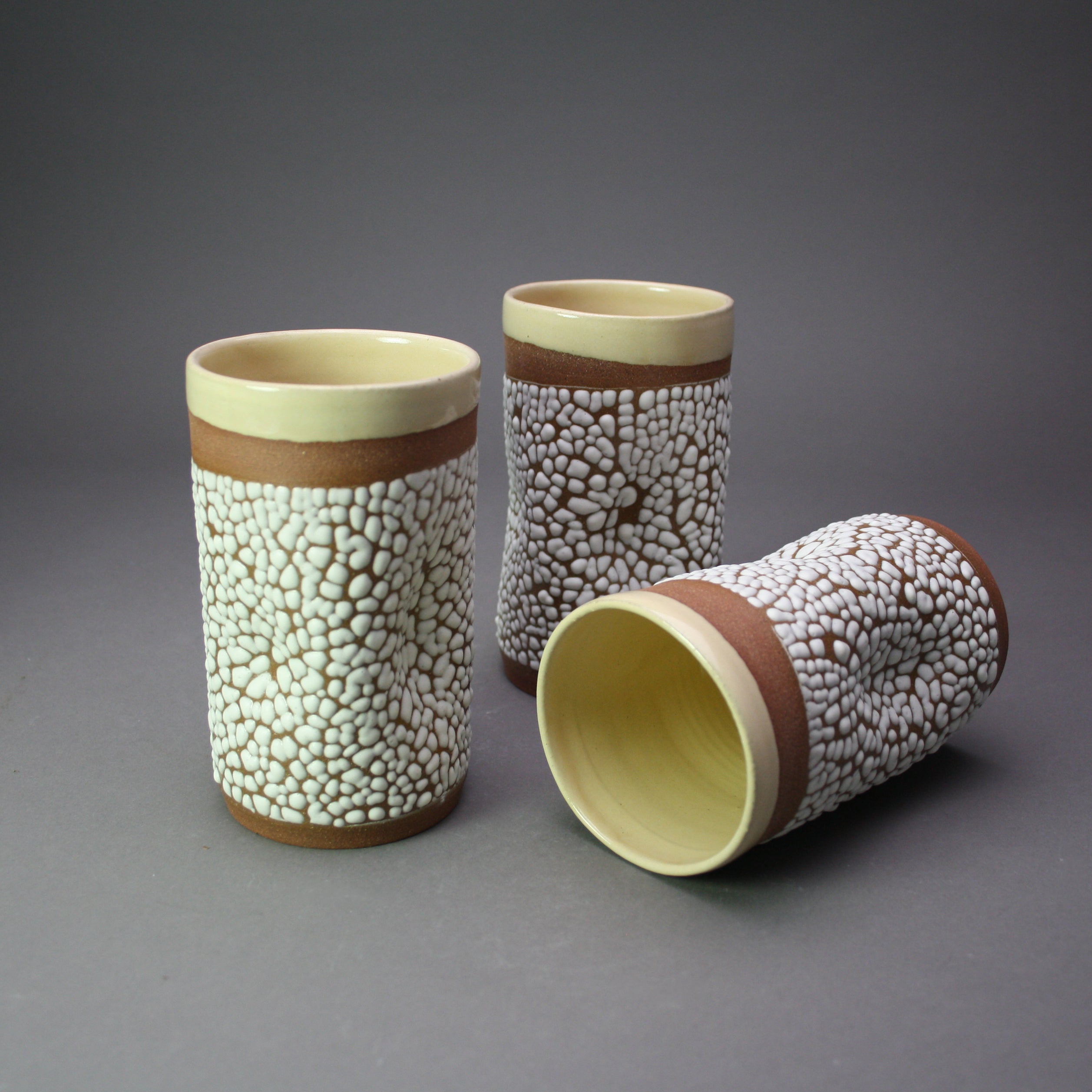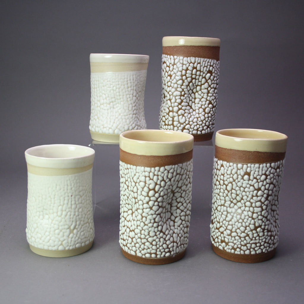 This tumbler is made with red stoneware. It features a white crawl glaze on the outside and a yellow glaze on the inside.