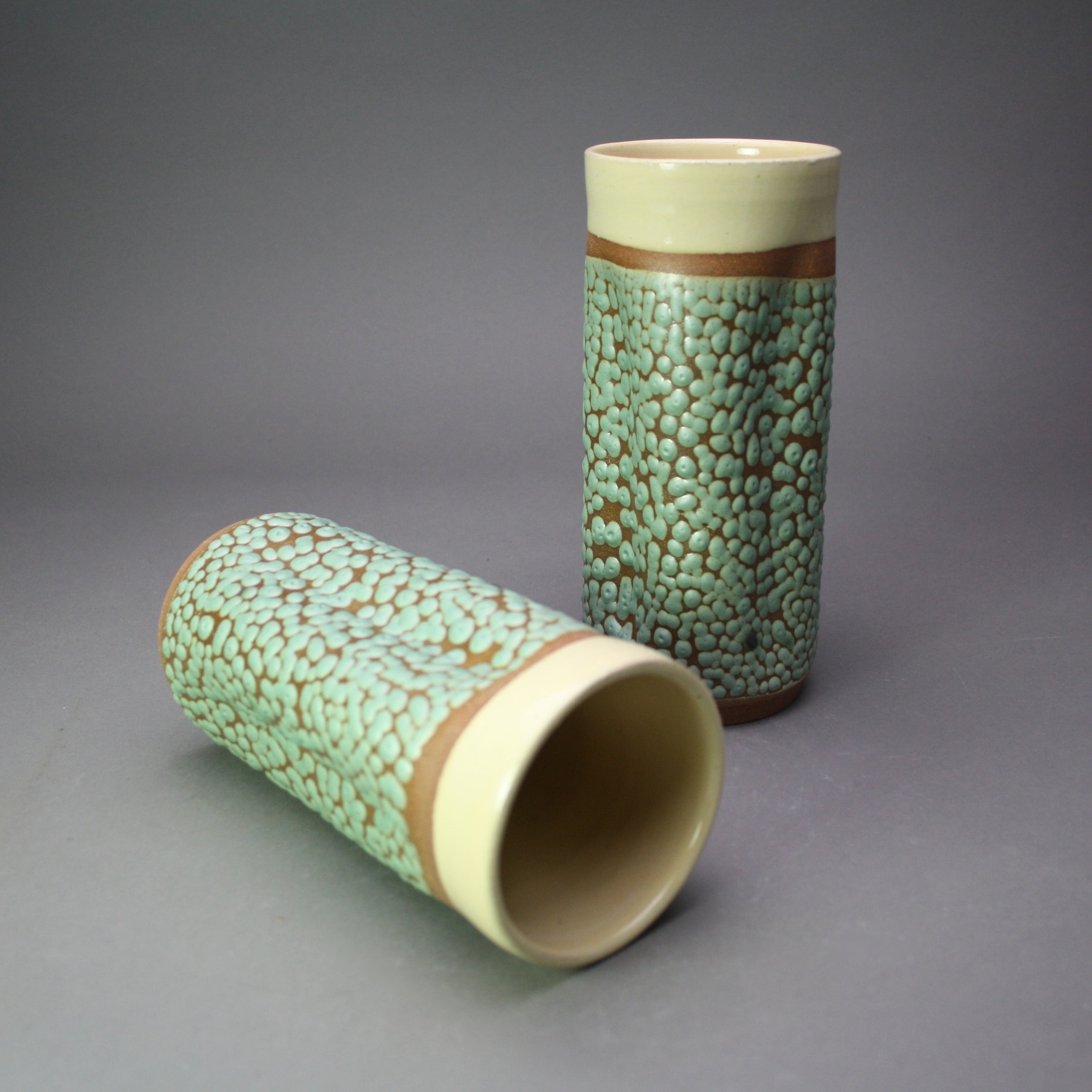 This vase (or beer stein) is made from red stoneware. It features green crawl glaze on the outside and yellow glaze on the inside.
