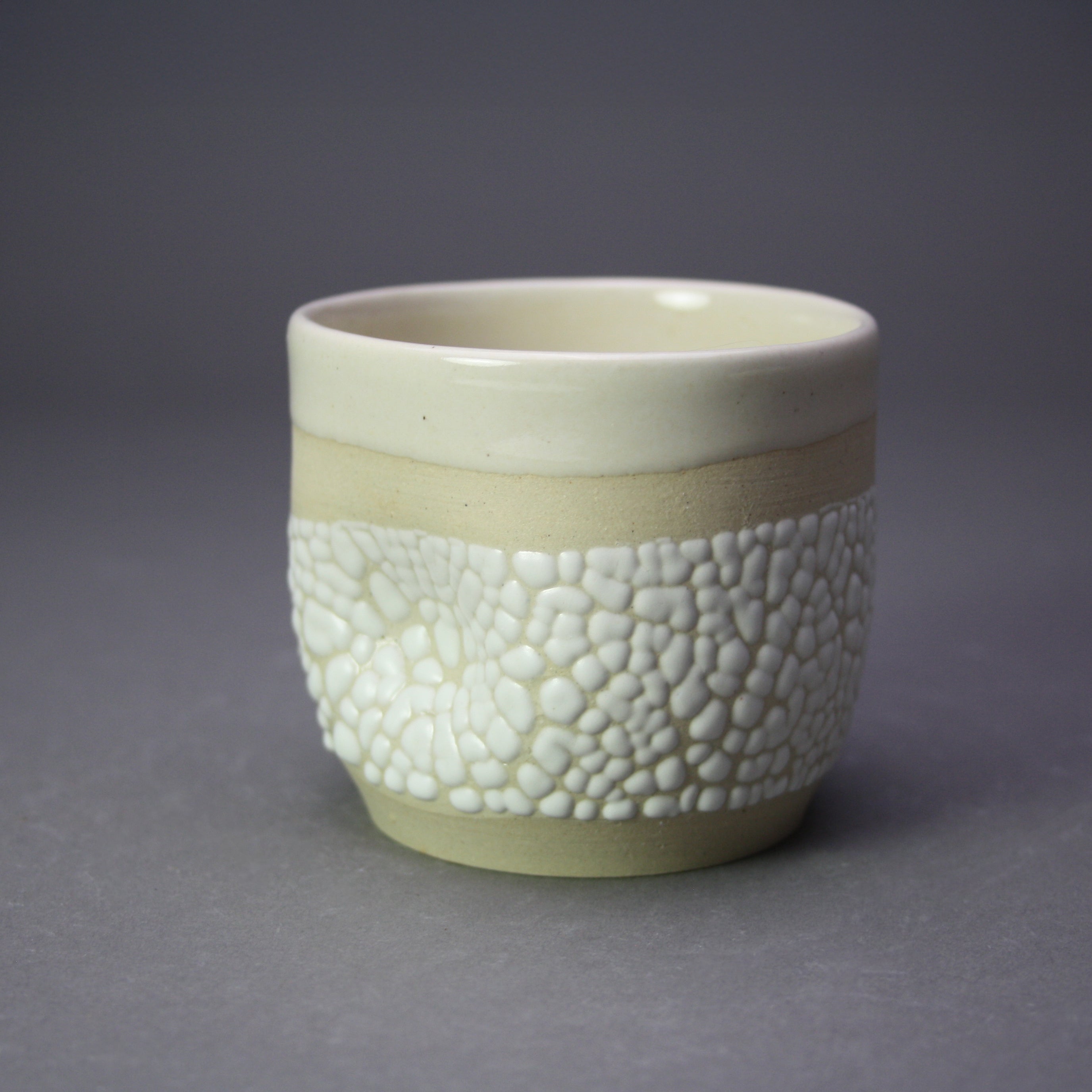 This wine cup is made with white stoneware and white crawl glaze. It has a white glaze on the inside.