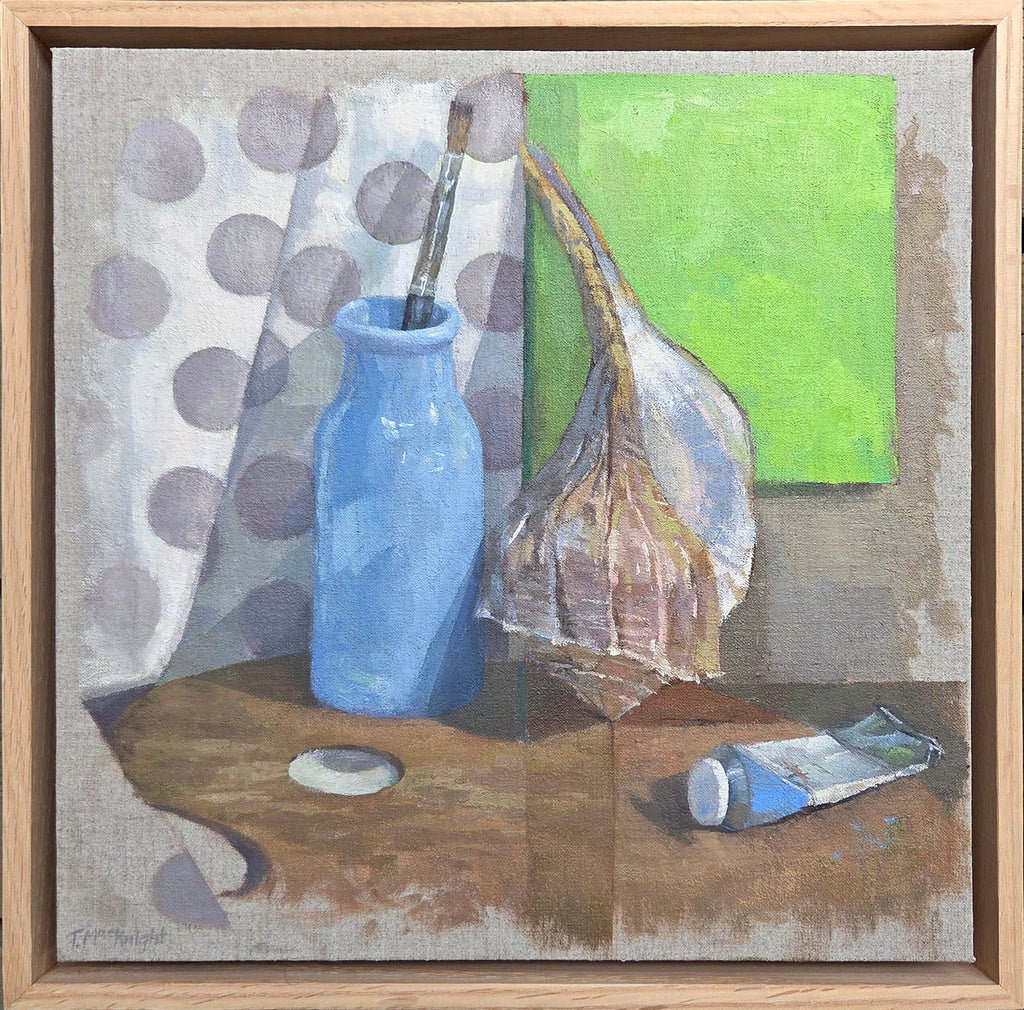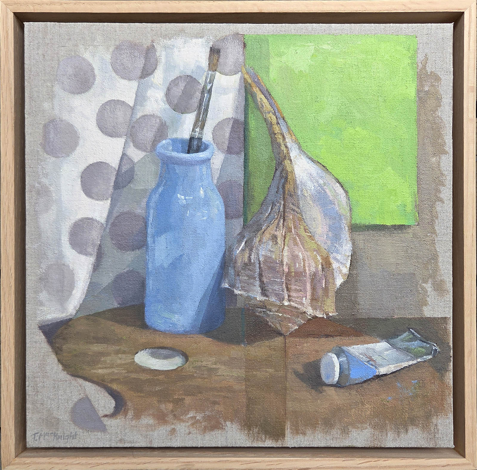 This oil on linen on wooden panel was created in 2025. It has been framed with an elegant 2 in. deep RusticBurl red oak floating frame. The framed dimensions are 13.25 x 13.25 in.